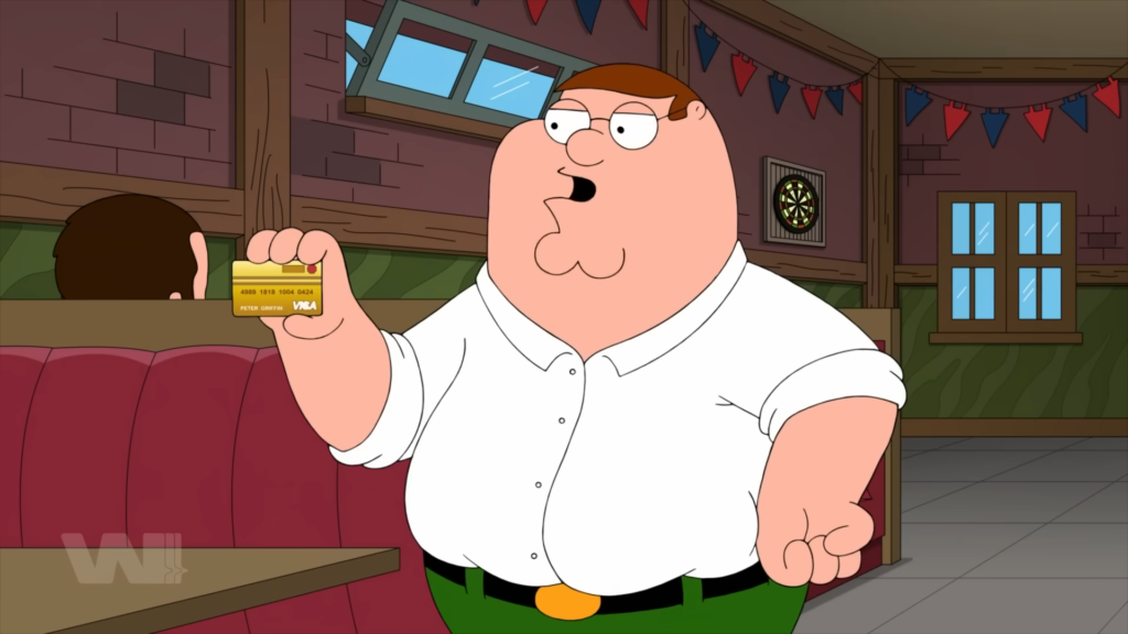 Family Guy dùng Visa và Mastercard như biểu tượng cho văn hóa tiêu xài và nợ nần mất kiểm soát.