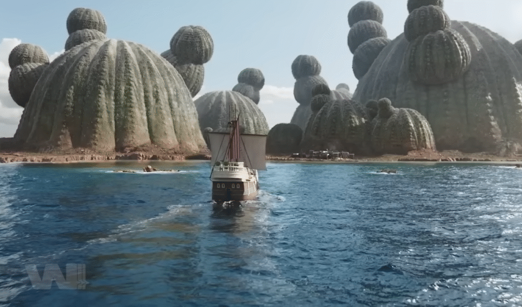 Qua mấy khung hình thoáng qua, khán giả có thể nhận ra các sườn núi xương rồng đặc trưng của Whisky Peak. Trong nguyên tác, cư dân trên đảo đón các băng hải tặc bằng rượu ngon, nhạc hay, nụ cười hiếu khách… rồi tối đến mới lộ mặt là thợ săn tiền thưởng. Tinh thần hai mặt của hòn đảo hình như được giữ nguyên, thêm chút ánh đèn vàng ấm áp để khung hình có mùi cạm bẫy.